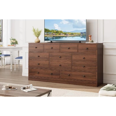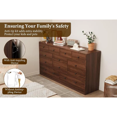 Upgrade your home organization with this expertly designed 12-drawer dresser, offering a smart and efficient storage solution for any room. Its compact design maximizes space while featuring three sizes of drawers, each tailored to your storage needs—the spacious large drawers are ideal for bulky items like blankets and bags, medium drawers neatly hold shirts, pants, and dresses, and smaller drawers are perfect for accessories, socks, scarves, and more. Whether you’re storing clothing, toys, books, or household essentials, this dresser brings versatile organization to bedrooms, closets, living rooms, hallways, dorms, or offices, ensuring a tidy and clutter-free environment.Built for strength and safety, each drawer glides smoothly on a sturdy sliding track system with ergonomic round handles, making access effortless. The wide dresser legs provide remarkable stability, minimizing movement even when fully loaded, and included anti-tip hardware adds an extra layer of safety for peace of mind in any household.Adding modern convenience, this dresser’s top is equipped with a built-in power outlet featuring two AC plugs and two USB ports, perfect for powering and charging lamps, phones, tablets, speakers, and other electronics—an invaluable feature for rooms with limited access to outlets. The drawer fronts, crafted with blister molding technology, are durable, waterproof, and easy to maintain, combining longevity with a refined texture that enhances any decor.For your convenience, the dresser is safely packaged with protective foam and shipped in two boxes to prevent transit damage. Assembly is easy thanks to detailed instructions, clearly labeled components, and all tools included—typically taking just 90 minutes to complete. Should you have any questions or need assistance before or after purchase, our professional customer service team is always on hand to support you, ensuring a smooth and satisfying experience from start to finish.
