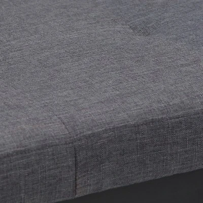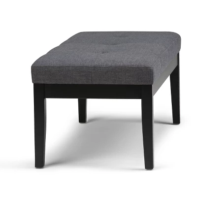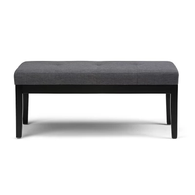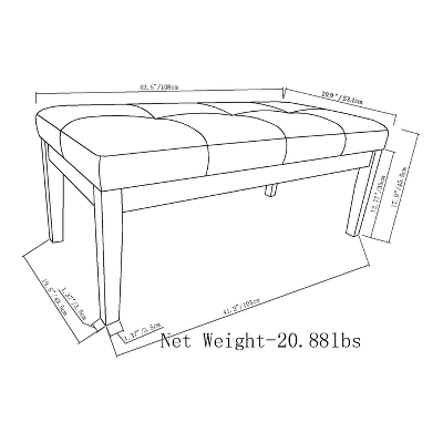 Abbey 43 inch Wide Contemporary Ottoman Bench. Available in Distressed Saddle Brown or Distressed Black Faux Air Leather or Slate gray Linen Look Fabric. Tufted and Stitching Detail. Distressed Black Faux Air Leather. Simple assembly; just attach legs. . Efforts are made to reproduce accurate colors, variations in color may occur due to computer monitor and photography. The product is warranted to be free from defects in material and workmanship to the original owner for the life of the product (conditions apply).