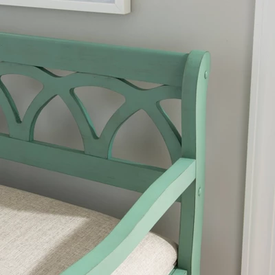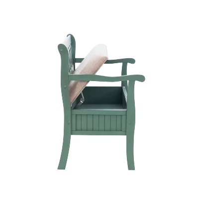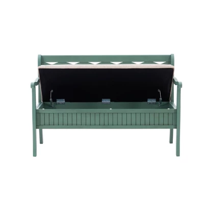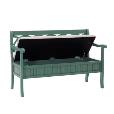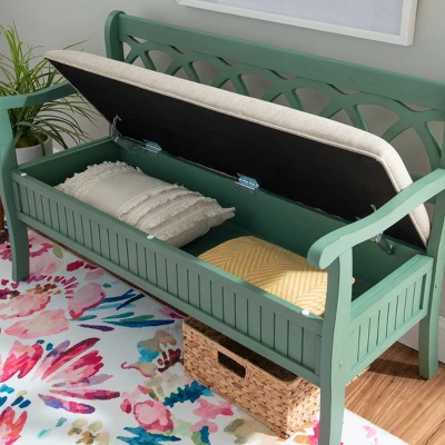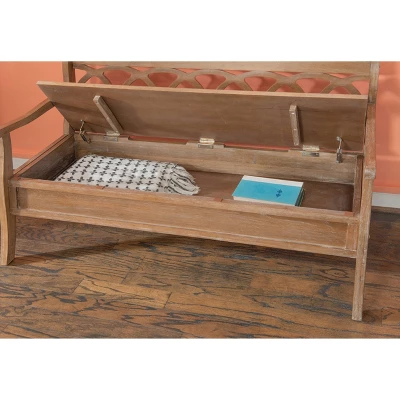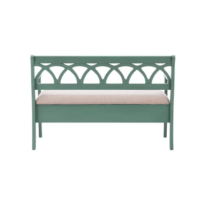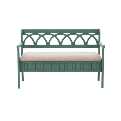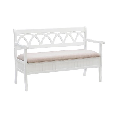 The Alina Storage Bench adds a stylish touch to your home. The 48″ lift top storage bench opens to deep storage with a built-in separation divider in the center for organization. Safety is a priority with child safe hinges and breathe holes. The bead board detailing on the front and sides adds charm, while the slightly curved arms accentuate the back decorative arched fretwork details. With a comfortable seat, the bench is upholstered with a neutral, menswear inspired fabric.