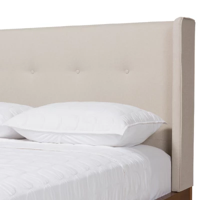 Frame your bed with the luxurious and relaxing looks of the Brooklyn platform bed. Constructed of durable rubber wood frame and legs in walnut finishing for a strong hold while you sleep, the Brooklyn is upholstered in polyester fabric for a soft and lightly textured feel. With winged headboard decorated with buttons and edge piping for grandeur detail and added elegance to your bedroom look, the Brooklyn showcases an understated mid-century modern design ensuring a timeless and sophisticated style with modern edge. Neutral tone complements various bed linens and color schemes for a complete design in your bedroom. Perfect for you to lean back on as you sit up in bed with a good book, the Brooklyn requires assembly.