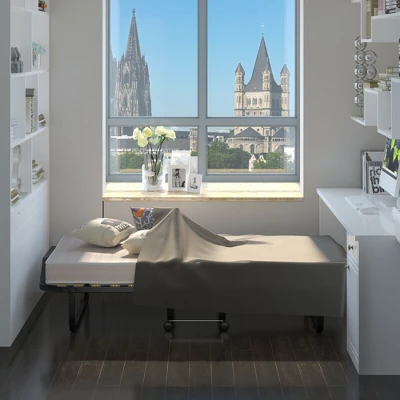 Are you worrying that there is no extra bed for visitors? Our folding bed can meet your needs. The mattress is filled with selected and highly elastic memory foam to provide you and your guests with a comfortable sleeping experience. It is supported by upgraded metal frame with delicate to ensure maximum sturdiness and durability. It can hold up to 240 lbs without shaking. What’s more, it only takes up a small room of 36” x 44” x 13” when you fold it up. Equipped with 360-degree wheels and convenient handles, this compact folding bed allows you to create a space for overnight guests. It is perfect for living room, bedroom and more.