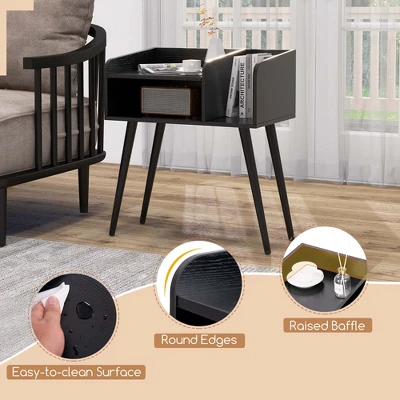 With open shelves for both display and storage, this bedside table is perfect for holding daily essentials such as books, lamps, clocks, and decorative items, keeping your space organized. The raised baffle design prevents items from falling off, while the ound edges esnure safety. The nightstand is equipped with metal support legs that ensure stability and long-lasting use. Its easy-to-clean surface and 14.5″ clearance underneath make maintenance effortless. The sophisticated mid-century modern design adds a touch of elegance to any bedroom, living room, or office, making it a versatile piece for various occasions.