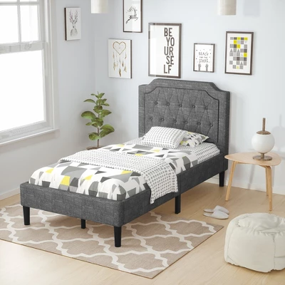 Our bed meets your daily needs for sleep, leisure and storage. It is made of ten wood slats to ensure a durable construction that lasts for a long time. The extra middle support legs improve the stability of the whole frame, which has strong weight capacity of 450lbs. Combining soft sponge with breathable polyester fabric, the headboard ensures pleasant using experience whether against or lying down. The bottom of bed is high enough for you to storage and creates a tidier room. This bed frame offers you a comfortable sleeping experience with reliable quality. Featuring elegant button-tufted design, this bed has an outstanding look and suitable for various room styles.
