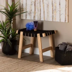 - Rectangular bench with ash frame and woven back