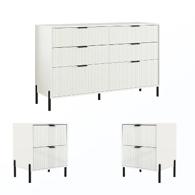 - Includes: Anti-Tip Anchoring Hardware, 2 Nightstands, 1 Horizontal Dresser (no mirror)
