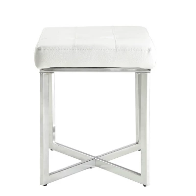 The Julia Vanity Bench is a padded bench that provides stylish additional seating and accents for any room of the home. Bench features a sleek design and a button-tufted Faux leather Seat. With a X Base Sled leg for added Style and sophistication. Place this bench anywhere extra seating is needed.