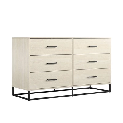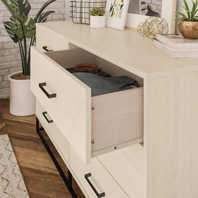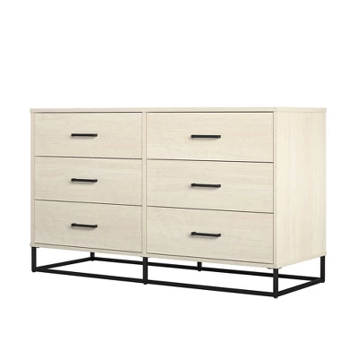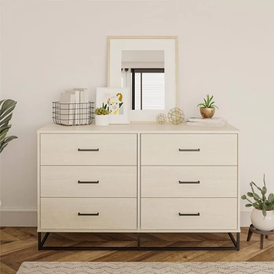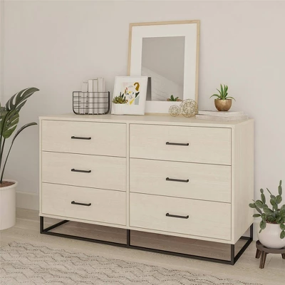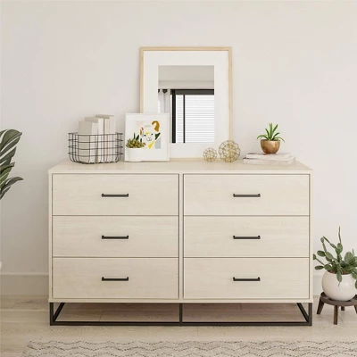 Clean out the clutter in your closet by storing away folded clothing in the Novogratz Kelly 6 Drawer Dresser. Store away sweaters, jeans, t-shirts, and extra linens in the 6 spacious drawers. Store away clothing and extra linens in the 6 drawers that feature durable metal slides for a build that will last, the off-white woodgrain finish pairs with the metal base and hardware for a trendy look.