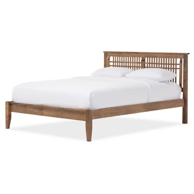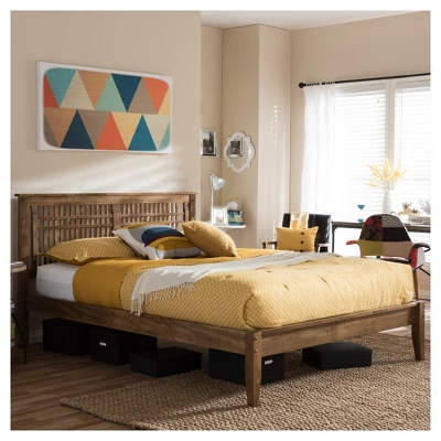 Tropical influences show forth in this walnut finished, eco-friendly solid rubberwood Loafey platform bed. Tapering front legs block style rear legs and a slatted, trapezium-shaped headboard with narrow vertical and horizontal slats, combined with angular elements are featured in this beautiful bed. The Loafey platform bed totally defines the room it is in. Its craftsman pattern of lattice work set within handsome tapered legs is as satisfying as it is beautiful. Featuring modern classic, the Loafey full size bed goes beyond trends and season statements. Low footboard creates an illusion of open space while the bed under clearance area provides some storage space. Made in Malaysia, the platform bed requires assembly.