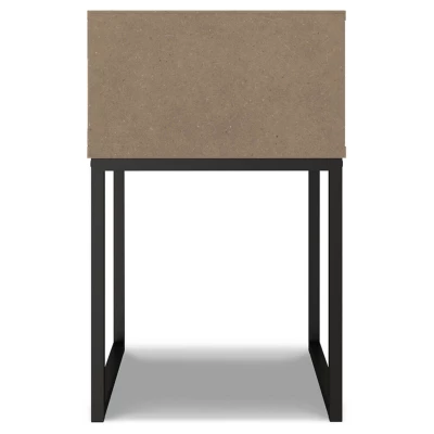 Streamlined design and a stunning finish come together in one simply extraordinary piece. This single drawer nightstand is sure to impress with canted metal legs and a rustic butcher block finish over replicated pine grain texture. Its mid-century profile is a nod to the past, while the updated finish keeps it solidly in the present. Signature Design by Ashley is a registered trademark of Ashley Furniture Industries, Inc..