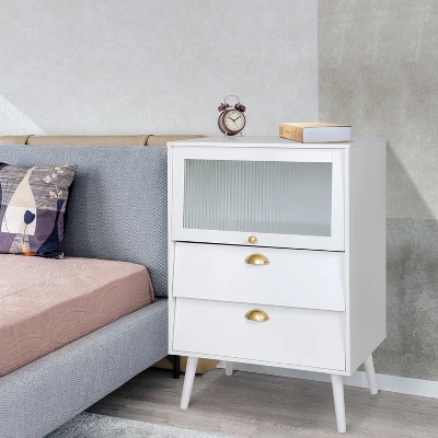 This nightstand is the perfect addition to any bedroom with its sleek and minimal design. Crafted with 0.47″ PB, this nightstand is both durable and stylish. The glass doors provide a sleek touch while also allowing for easy visibility of your stored items. The antique bronze handles give this piece a vintage feel that complements any decor.Standing at 23.62″L×15.74″W×35.04″H, with 7.08″H legs, this nightstand is the perfect height for any bed.