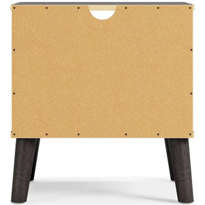 The perfect marriage of contemporary and casual vintage, this nightstand is a charming addition to your home. It features an expressive two-toned look, with a dark charcoal finish over replicated oak grain with an authentic touch and a replicated sugarberry wood grain. Matte black knobs and splay legs add a finishing touch, while the open shelving allows for extra storage. Signature Design by Ashley is a registered trademark of Ashley Furniture Industries, Inc..