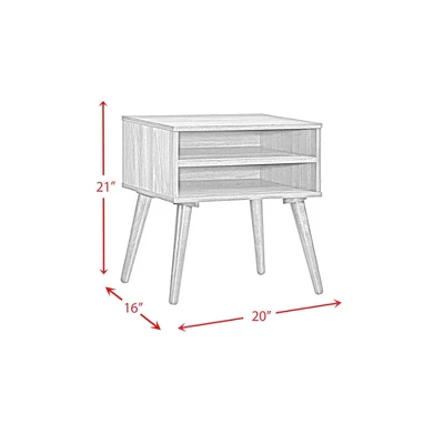 - Nightstand includes two open spacious shelves