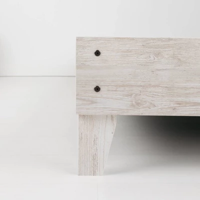 - Two-tone white wash and rustic gray planked replicated oak wood grain finish with authentic touch