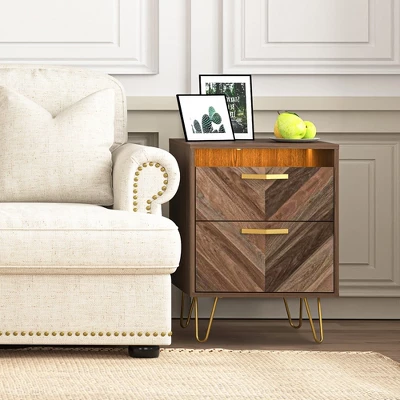 The combination of classic retro brown and matte gold brings a modern and stylish touch to this wood-grained Night Stand. It is suitable for home decoration in various styles. It can also be used as a side table or end table in the home to attract attention and add elegance to home life. This modern LED Night Stand can be remotely controlled by mobile phone APP or remote control. The light has multiple changing modes and can move with the rhythm of music. When you don’t want to actively control the light remotely, you can also set the time you want in advance for automatic switching. The bedroom bedside table is equipped with an anti-tipping device to avoid hitting children and pets. The height of the matte gold metal legs is enough for your sweeping robot to clean the floor without moving it hardModern Night Stand with Mobile APP Remote Light, Jointed Wood Grain Bedside Table for Bedroom Rustic Brown