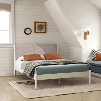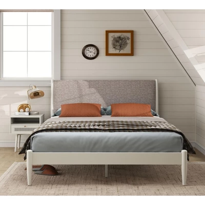 - [PLATFORM BED]: Expertly crafted, this long-lasting bed is made with a rubberwood frame, straight wooden slats, integrated rails, and support legs. The grayish-upholstered headboard is padded with breathable fabric for comfort. Finished in cream-white, it adds a simple yet elegant touch to your bedroom.