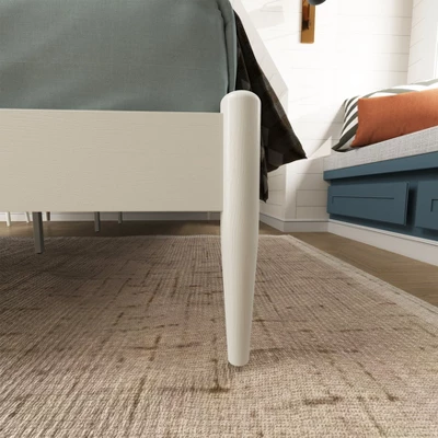 This set includes a bed and a nightstand. Its upholstered headboard is wrapped in breathable fabric, offering cloud-like comfort and understated elegance. With a cream white finish and cylindrical legs, it creates an appealing and fresh look. Crafted from durable rubberwood, this bed ensures lasting durability. A matching nightstand completes the set, featuring a dual-tier design and decorative woven pattern that addes subtle elegance. The nightstand is constructed from rubberwood and MDF in the same finish, making it a stylish and practical addition to your bedroom.No box spring is required. Upgrade your bedroom with the Feeney Collection today!