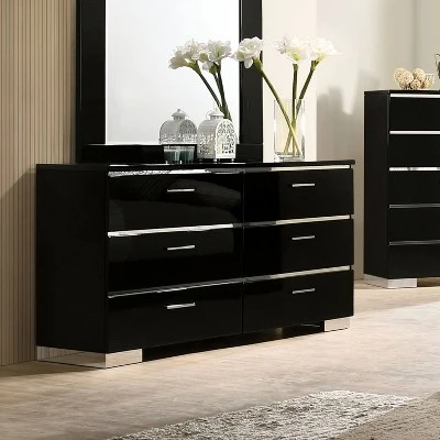 When it comes to bedroom decor, an elegant dresser with plenty of storage space is essential. Allow this beautiful, black double dresser to create an ultra-chic enhancement to your personal space. Gleaming chrome embellishments add style and pizzazz, while the six roomy drawers allow for easy organization and a neat, put-together bedroom.