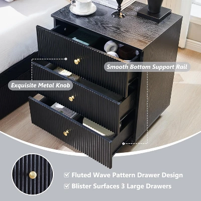 This bedside table is made of high-density engineered wood, which is strong and durable, capable of withstanding daily use and resistant to wear and tear. Its surface is finished with eco-friendly paint to ensure water resistance and easy cleaning, while the natural wood grain (available in natural, black or white) complements the wave pattern, presenting a refined appearance. The golden metal handle adds a touch of elegance and enhances its visual appeal.