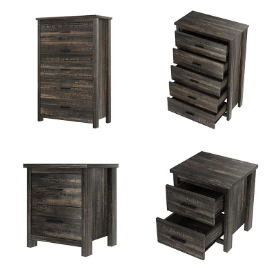 - Queen size 4-piece bedroom set includes bed, two nightstands, and a 5-drawer dresser for a fully coordinated look
