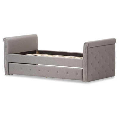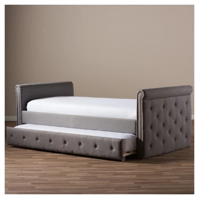 Baxton Studio Swanson Modern and Contemporary Fabric Tufted Daybed with Roll-Out Trundle Guest Bed. Contemporary style is the perfect pick to match your interiors style. Modern and contemporary daybed with roll-out trundle guest bed. Polyester fabric upholstery. nail heads. Rolled arms with button-tufting designs on the side panels. Made in Malaysia.. Assembly is required.