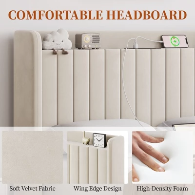 - Create the bedroom of your dreams with this beautifully designed bed frame. Upholstered in soft, luxurious velvet, the bed frame creates a cozy haven where you can unwind in comfort. The upholstered storage headboard, complete with charging ports, serves as a functional yet stunning focal point. The graceful, curved wing side headboard embraces you, adding a touch of refined simplicity. With a sturdy wooden slatted design, this platform bed eliminates the need for a box spring, combining convenience and luxurious sleep in one elegant package.